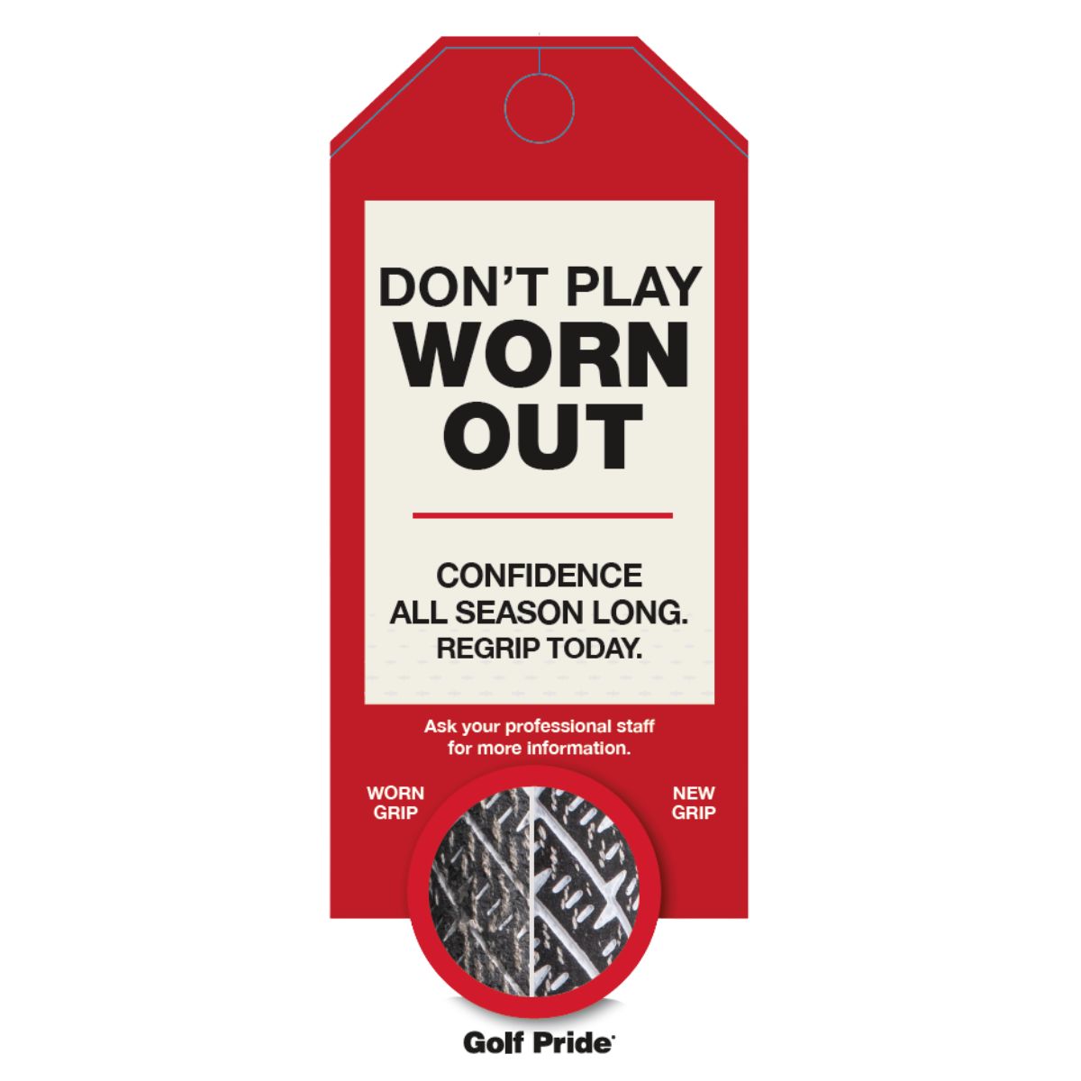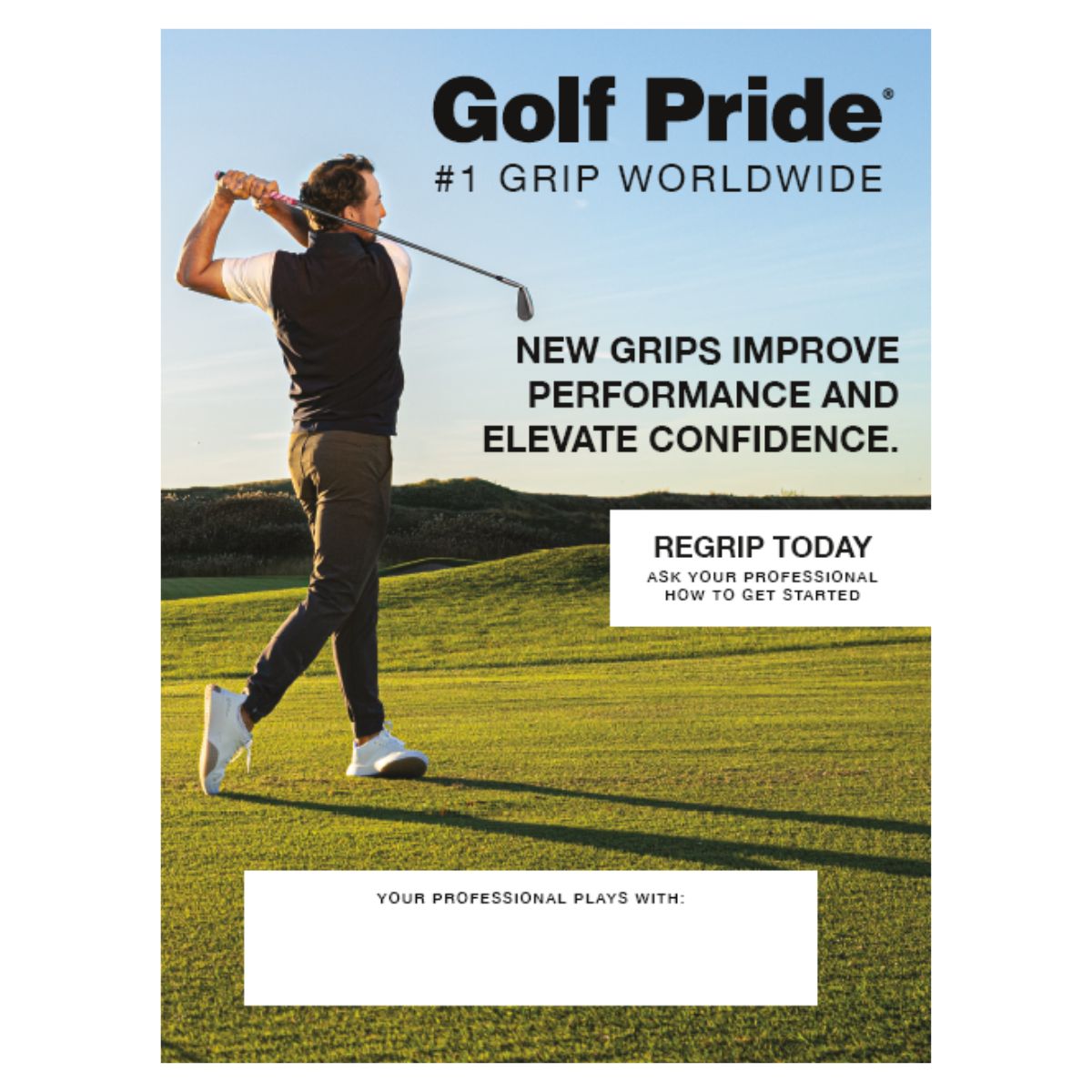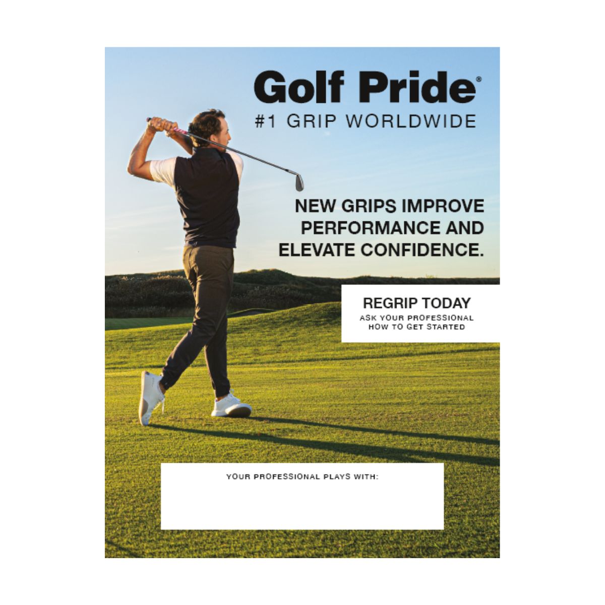 Regripping Promotional Materials CATALOG HOMEGripsRegripping Promotional Materials AccessoriesClubsBagsCartsTravel CoversGripsSwing GripsPutter GripsTraining GripsRegripping Promotional MaterialsRepair SuppliesShaftsCourse Equipment Golf Pride Acrylic Counter SignGolf Pride Hang TagsGolf Pride Putter Grip PosterGolf Pride Regrip Today Poster